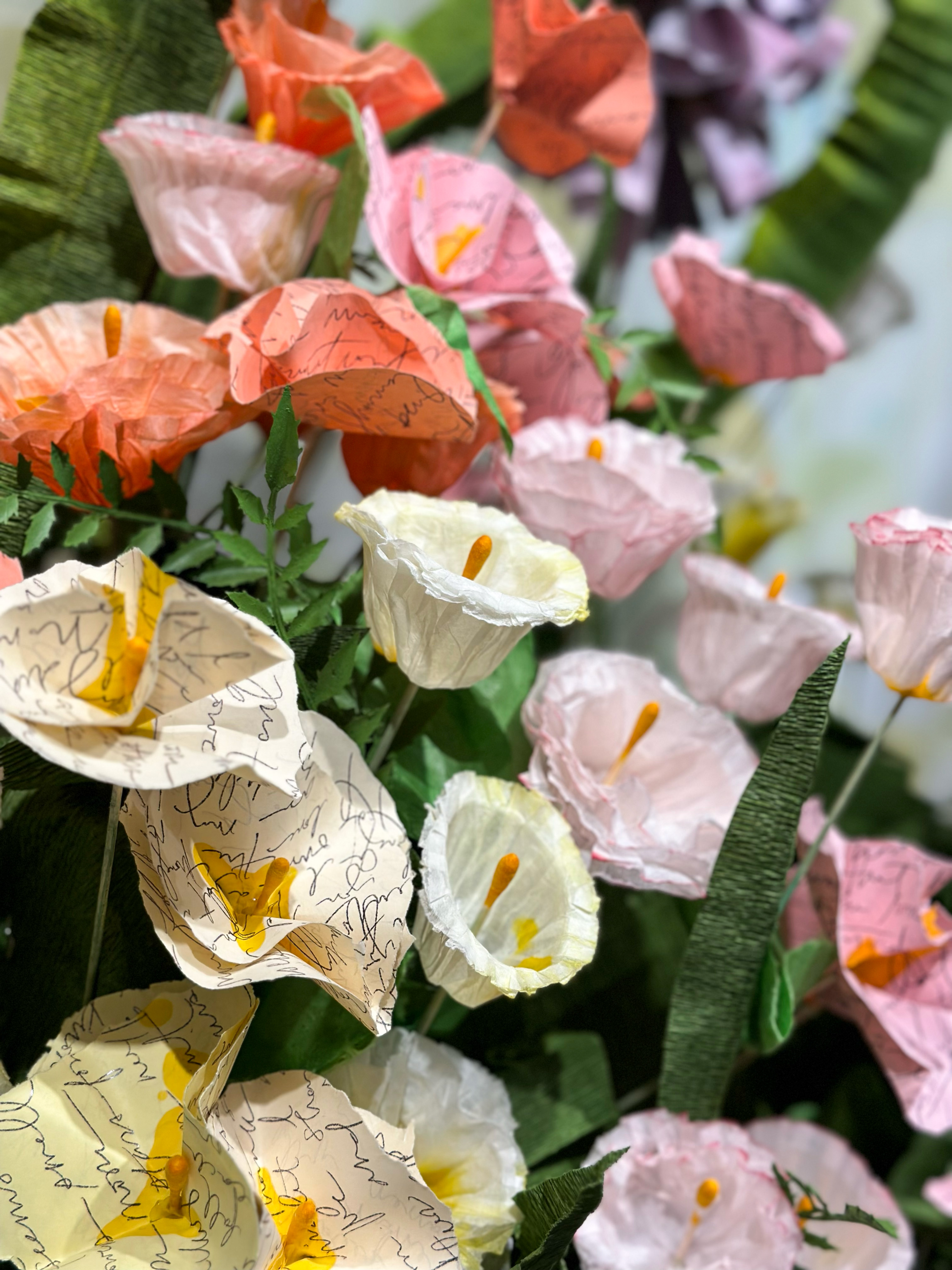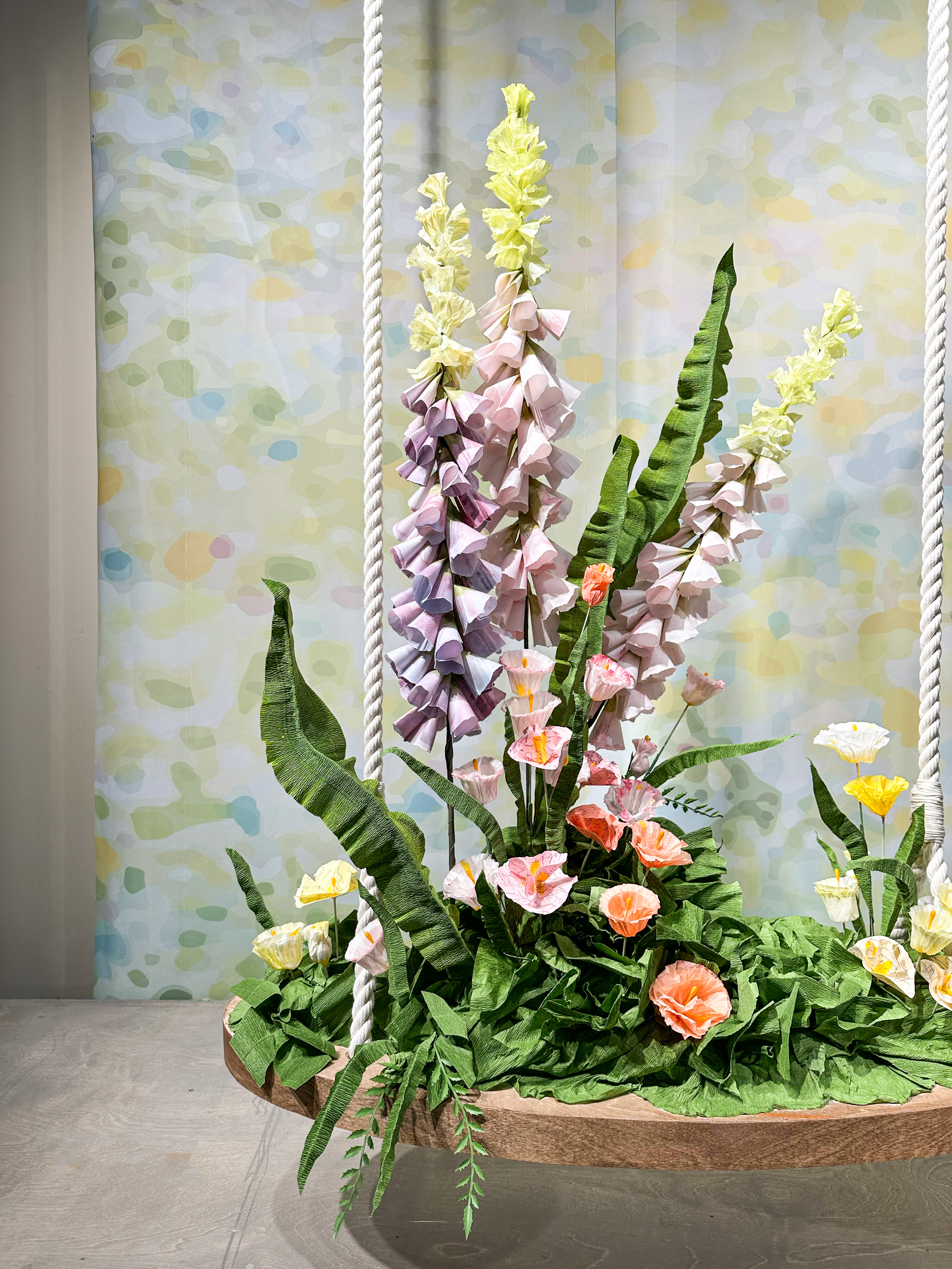 The inspiration for this window is a return to romanticism and sharing appreciation for others – whether that’s a significant other, best friend, or family member. Flower patches sprout up from floating swings in a nod to your favorite park. The flowers are made from paper cones and washed in ink to create beautiful buds reaching toward the sun. Smaller poppy flowers with a cotton swab center and coffee filter petals fill the base. Amongst them some flowers bloom brighter than the rest – these are made of actual love letters our visual team has shared with their loved ones.