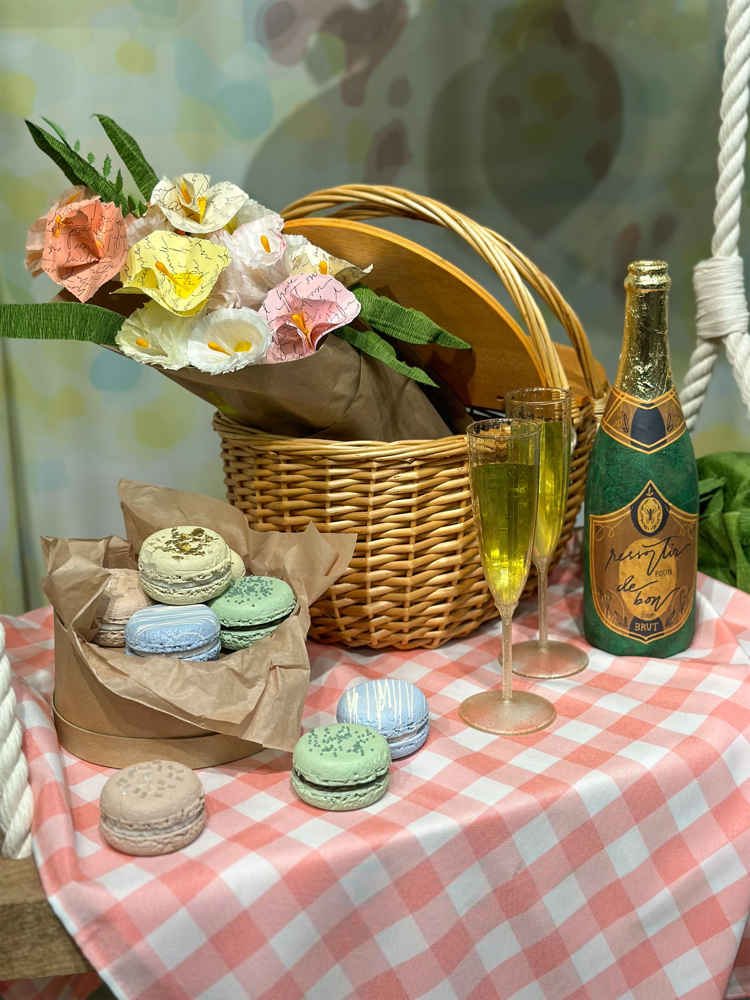 A spring day in the park wouldn’t be complete without a picnic. This one is made up of the best things that scream romance: champagne, macarons, and a bouquet. The macarons are made of foam with bead detailing. The setup looks so yummy you can almost smell the sweet almond of the macarons and feel the punchy effervescence of the champagne!